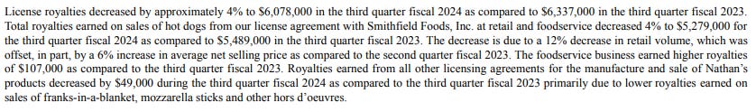 Branded products - selling hot dogs at parks and stadiums - is not a good business but I was surprised to see a drop in licensing royalties from Smithfield. The drop can be explained by a 12% decrease in retail volume vs. only a 6% selling price increase. I think it’s reasonable to assume a trading down dynamic as higher protein costs continue to squeeze the consumer. From the latest 10Q: